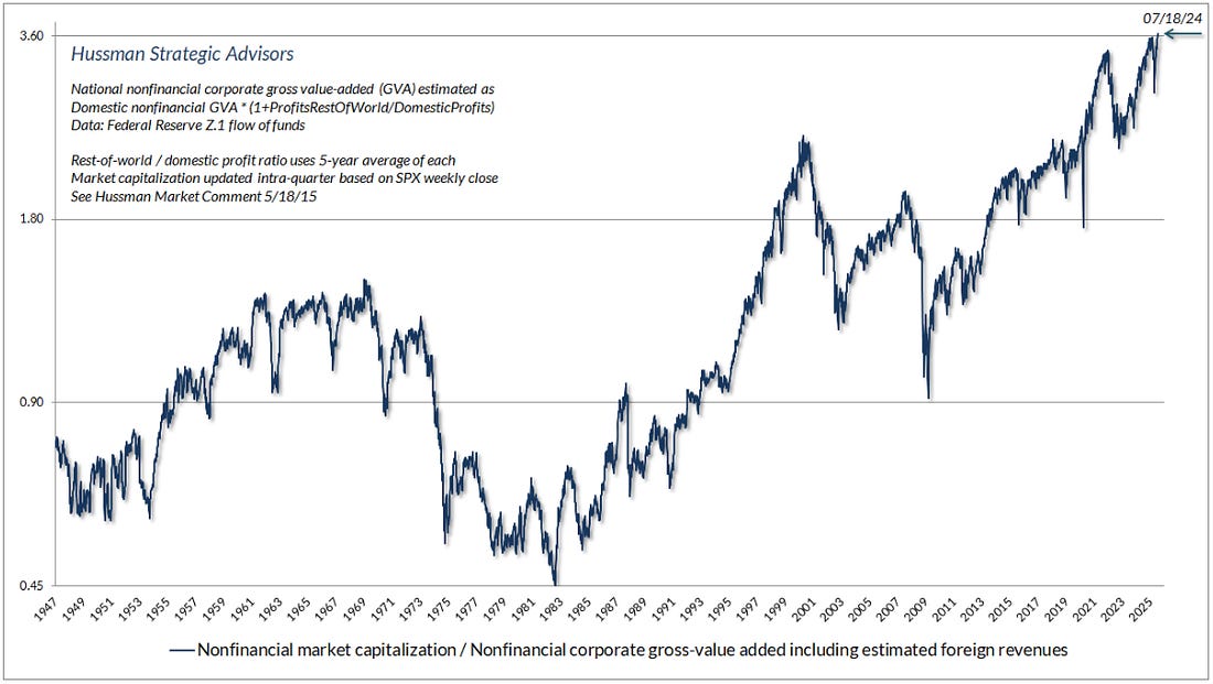 One notable person who does care is Warren Buffett. He has long advocated for comparing the S&P’s market value to the size of the economy. He has cited this so often that it has become known as the “Buffett Indicator”. As you can see, it’s flashing a strident warning totally in-sync with the Hussman approach.
