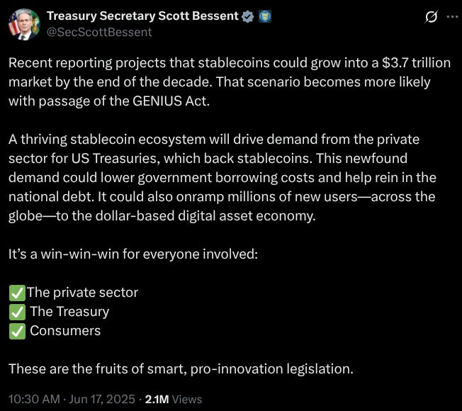 Let’s unpack this a bit: U.S. T-bills are the most popular stablecoin asset and are likely to stay that way for the indefinite future; the U.S. Treasury needs to rollover something like $6 trillion of maturing debt over the next 12 months, as well as fund the $2 trillion annual deficit; foreign buyers of Treasury debt are increasingly wary of U.S. fiscal policies and also their tax treatment (the proposed federal levy on overseas holders). Ergo, you can easily see why Mr. Bessent is so enthusiastic about having trillions of new buyers of T-bills (which is mostly what the Treasury issues to fund itself).