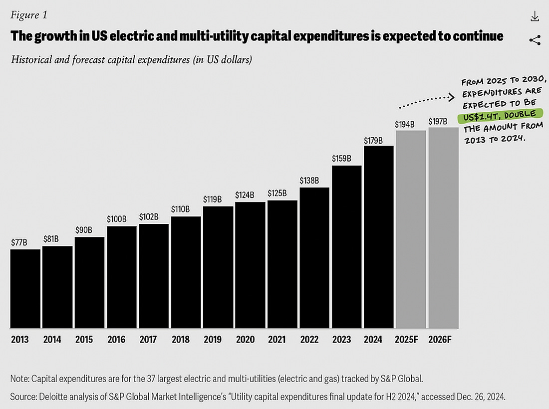 At the risk of stating the obvious, the U.S. power grid wasn’t built for this tsunami of demand and throughput. Interconnection bottlenecks, aging transformers, and regional load spikes are already straining transmission and distribution systems. In response, some utilities have been forced to revise their 10-year capital spending upward by billions. The system is groaning under pressure, and much of the investment world hasn’t yet caught on to the severity of the situation.